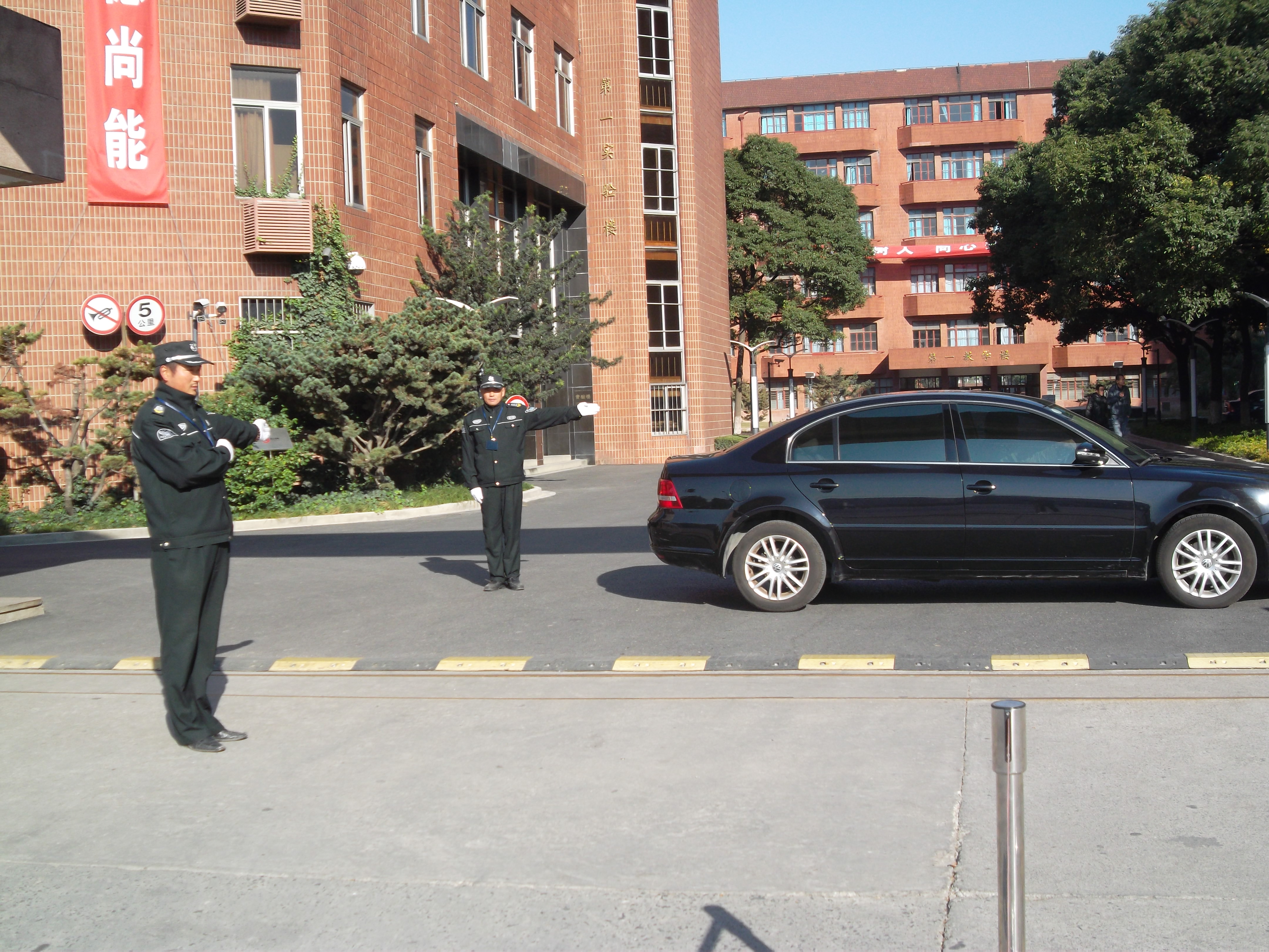 公司保安员正在进行指挥车辆进入校区 公司员工正在进行队列训练 公司召开工会成立大会