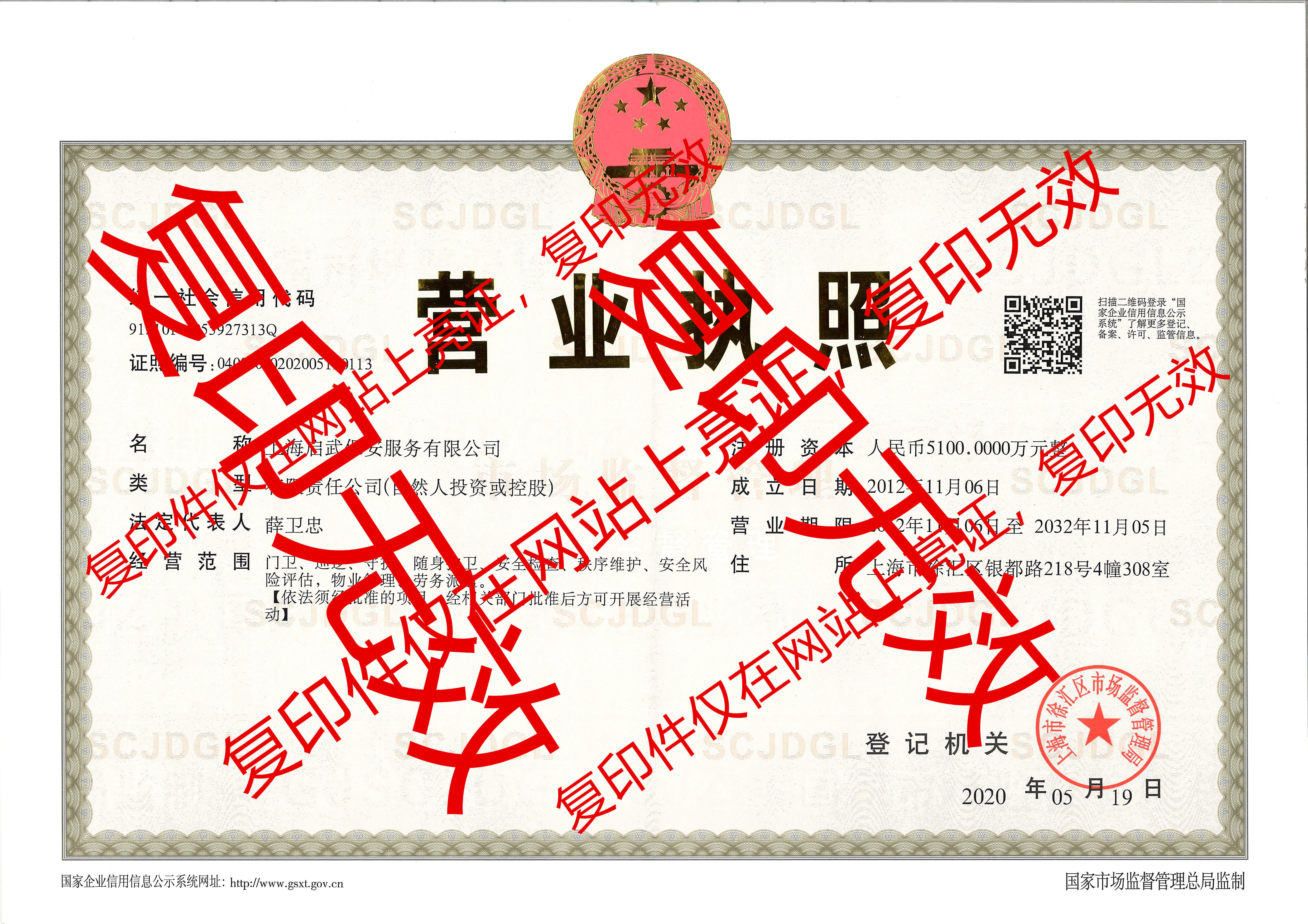 上海启武保安服务有限公司 保安服务许可证编号:公保服沪2012119号  地 址:上海市徐汇区银都路 298号4幢308室 电 话:021-51592811 51592815 51592816 传 真:021-51592877 邮 箱:yanqing.chen.hw@outlook.com 网 址:www.shqwba.cn